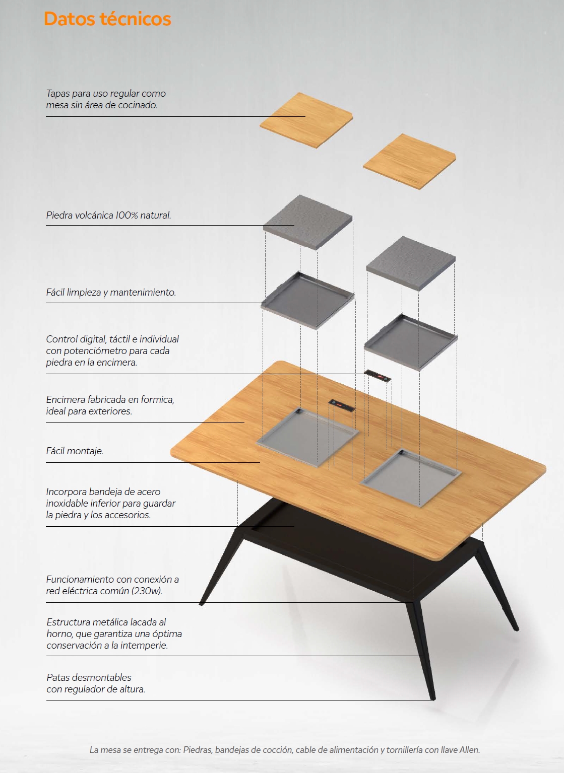 La empresa de nueva creación nos pidió un nombre comercial y un logotipo significativo y moderno para su producto: una novedosa mesa de exterior que incorpora placas volcánicas para que los comensales puedan cocinar sobre ella al momento y a su gusto.